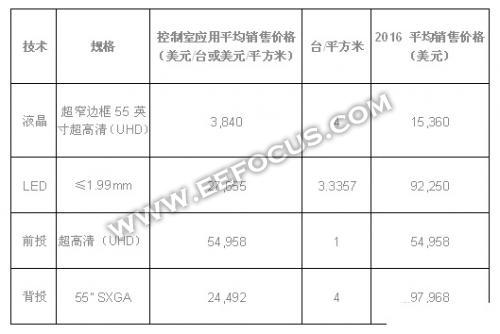 盡管在過(guò)去兩年間小間距LED屏的價(jià)格已經(jīng)大幅下降(從每平米7萬(wàn)美元左右降至約3萬(wàn)美元),但價(jià)格差仍然較為顯著。以下是基于標(biāo)準(zhǔn)55英寸超窄邊框液晶視頻墻的不同顯示技術(shù)平均銷售價(jià)格對(duì)比: