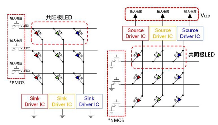 ♦ 圖2:共陽驅(qū)動(dòng)與共陰驅(qū)動(dòng)掃描屏電路架構(gòu)比較