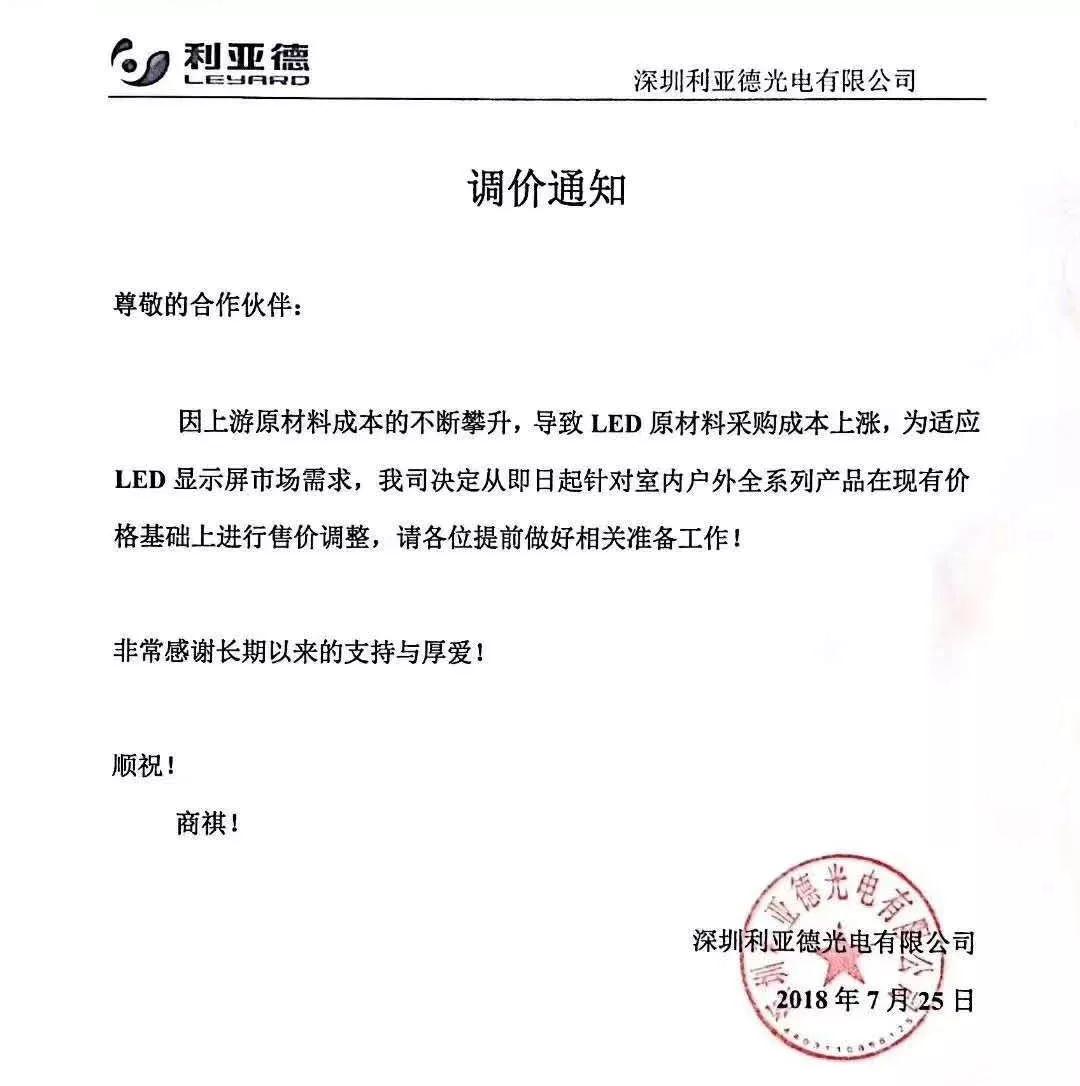 7月25日,LED顯示屏上市公司利亞德發(fā)布調(diào)價(jià)通知,稱因上游原材料成本的不斷攀升,導(dǎo)致LED原材料采購成本上漲,為適應(yīng)LED顯示屏市場需求,我司決定從即日起針對室內(nèi)戶外全系列產(chǎn)品在現(xiàn)有價(jià)格基礎(chǔ)上進(jìn)行售價(jià)調(diào)整。