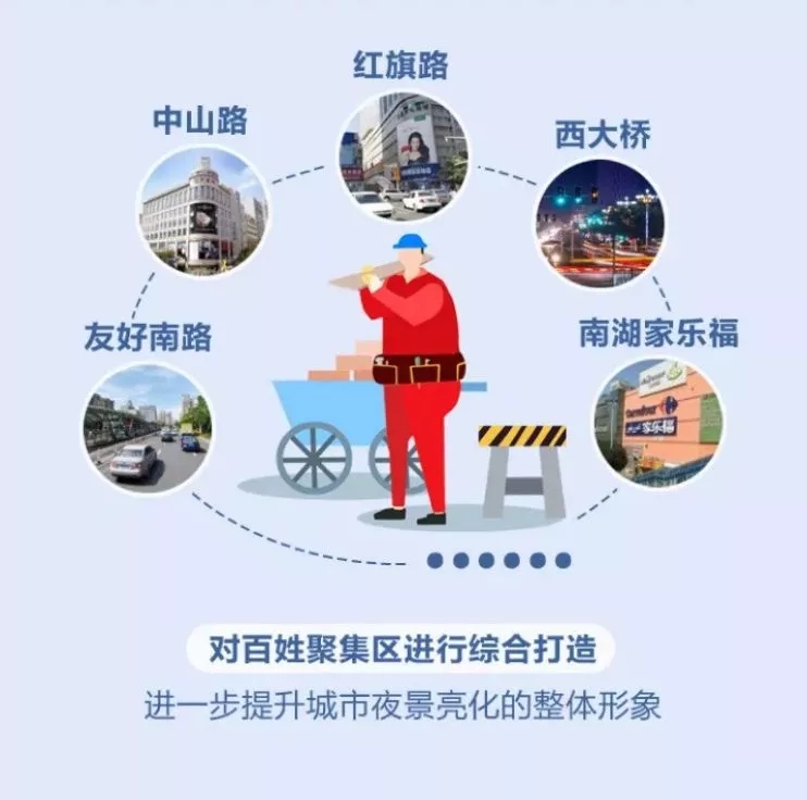 主要對中山路、紅旗路、西大橋、友好南路、南湖家樂福超市等市民、游客聚集區(qū)進行景觀照明設施綜合打造
