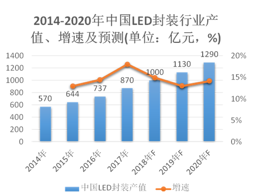 根據(jù)高工產(chǎn)研LED研究所(GGII)數(shù)據(jù)顯示,2017年全球LED封裝市場(chǎng)產(chǎn)值規(guī)模達(dá)到1493億元,其中,中國(guó)大陸LED封裝產(chǎn)值規(guī)模達(dá)870億元,同比增長(zhǎng)將近18%,全球占比達(dá)到58.27%。