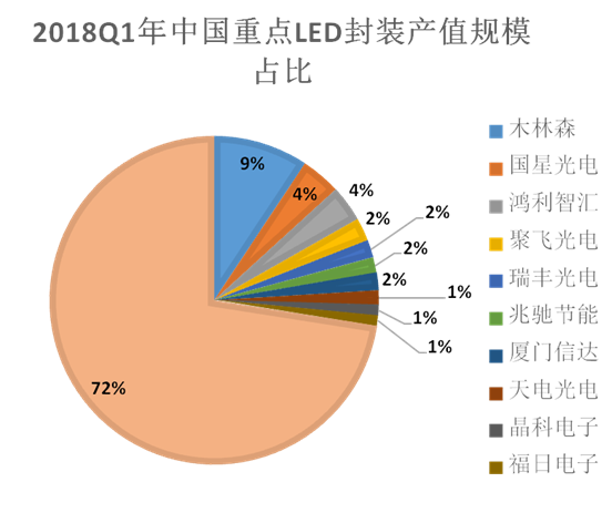 GGII預(yù)計(jì)2018年中國(guó)LED封裝產(chǎn)值增速將放緩,總規(guī)??赏_(dá)到1000億元。與封裝市場(chǎng)總值增長(zhǎng)形成正向?qū)Ρ鹊氖?,封裝巨頭的占比也在迅速提升。GGII數(shù)據(jù)顯示,2018年第一季度中國(guó)前十大封裝廠的比重達(dá)到28%。隨著木林森、兆馳等LED封裝大廠的擴(kuò)產(chǎn),2018年中國(guó)LED封裝行業(yè)集中度將進(jìn)一步提升,預(yù)計(jì)市場(chǎng)前十強(qiáng)產(chǎn)值占比可望達(dá)到32%左右。