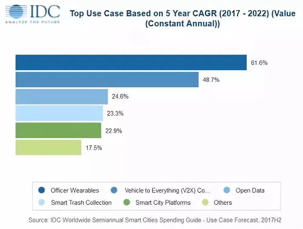 可以這樣說,IDC最新版本的全球智能城市支出指南的發(fā)布,是人們了解全球城市正在進(jìn)行何種轉(zhuǎn)變的重大進(jìn)展。IDC客戶洞察與分析小組的項(xiàng)目經(jīng)理Serena Da Rold表示:“在城市的支出方面,智能交通和數(shù)據(jù)驅(qū)動(dòng)的公共安全仍是智慧城市最大的投資領(lǐng)域。與此同時(shí),與后臺(tái)和平臺(tái)相關(guān)領(lǐng)域的支出也在不斷增長(zhǎng)?!眻?bào)告顯示,在支出方面,固定視頻監(jiān)控、智能交通和智能戶外照明這三大領(lǐng)域?qū)⒄紦?jù)2018年全球智慧城市技術(shù)支出的四分之一。而到2022年,智能交通管理方面的支出將超越排名第三位的智能戶外照明,三者在智慧城市技術(shù)總支出的比例將縮減至五分之一,這是因?yàn)槠渌⌒皖I(lǐng)域的支出正在不斷增長(zhǎng),特別是官方可穿戴設(shè)備(Fitbit/智能眼鏡)和車聯(lián)網(wǎng)(V2X)連接性,這兩大領(lǐng)域的支出增長(zhǎng)速度最快。