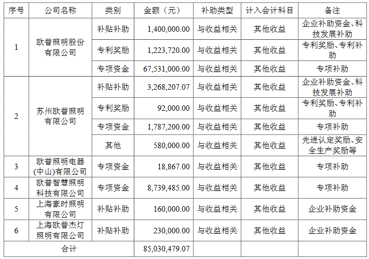 與木林森不同的是,歐普照明此次公布的是自2017年8月3日至2018年7月14日公司及控股子公司連續(xù)12個(gè)月內(nèi)累計(jì)收到與收益相關(guān)的政府補(bǔ)助情況,共計(jì)人民幣85,030,479.07元。