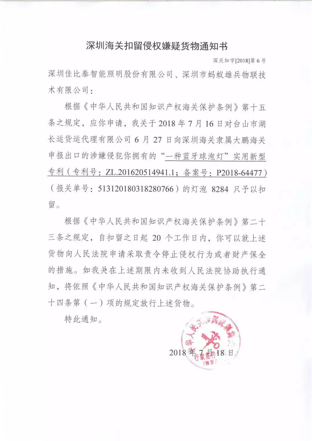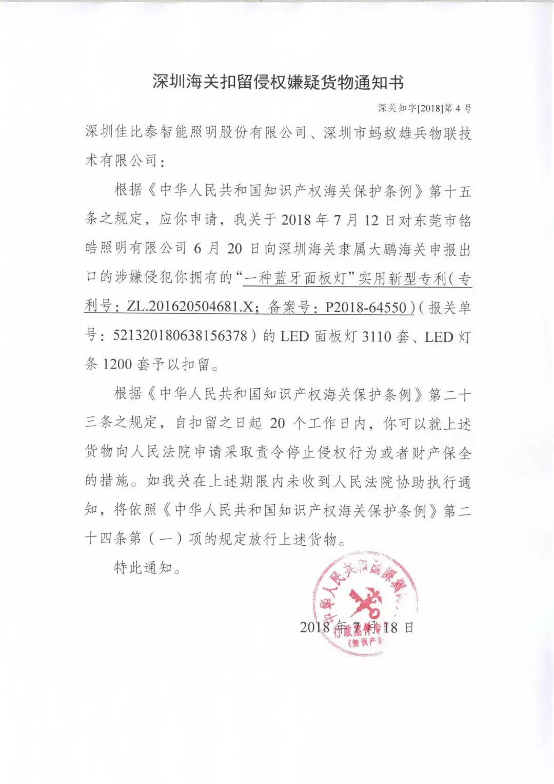 據(jù)悉,兩家廠家分別侵犯深圳佳比泰智能照明股份有限公司和深圳市螞蟻雄兵物聯(lián)技術(shù)有限公司擁有的“一種藍(lán)牙球泡燈”實(shí)用新型專利(專利號(hào):ZL.201620514941.1;備案號(hào):P2018-64477)(報(bào)關(guān)單號(hào):513120180318280766)、“一種藍(lán)牙面板燈”實(shí)用新型專利(專利號(hào):ZL.201620504681.X;備案號(hào):P2018-64550)(報(bào)關(guān)單號(hào):521320180638156378)。