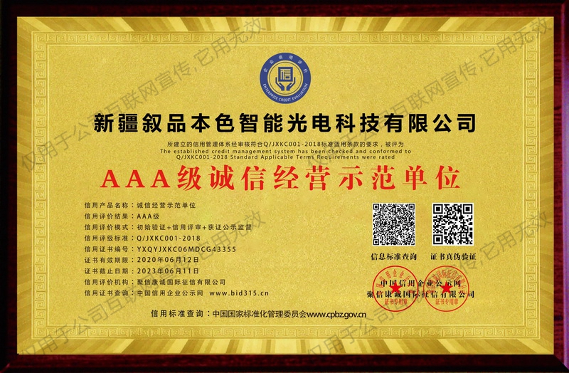 資質(zhì)名稱:AAA級誠信經(jīng)營示范單位_牌匾