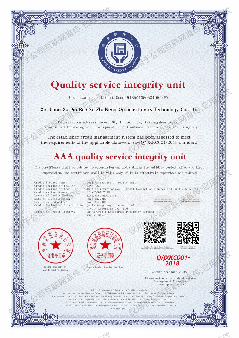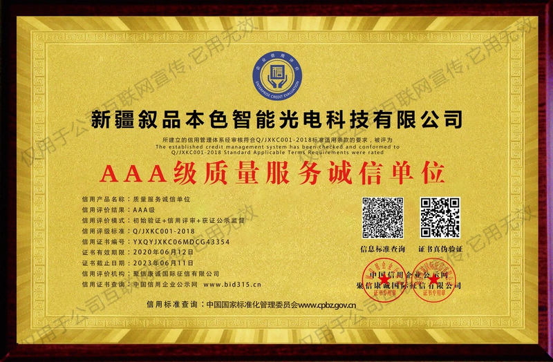 資質(zhì)名稱:AAA級質(zhì)量服務誠信單位_英文版